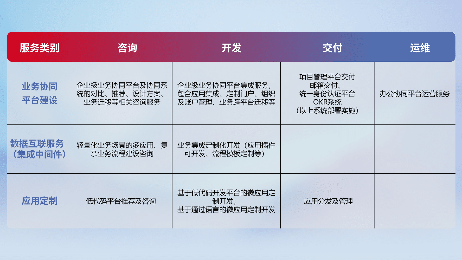 针对钉钉、、企微、、、、IDaas等平台级产品提供产品的规划、、、、方案、、、、交付、、、、定制化开发等服务,,实现如统一协同办公、、智能客户服务、、、混合会议管理、、、、智能数据查询、、、等业务场景,,实现数字化转型。。。